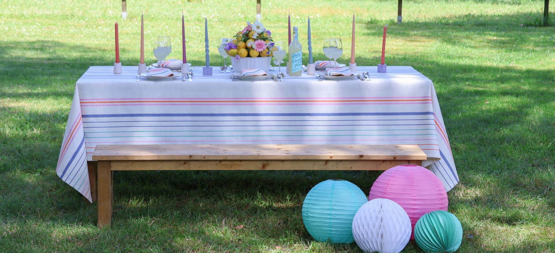 Notre nouvelle nappe enduite Bermeo Ombrelle incarne cet esprit printanier. Un nouveau pas de rayure aéré qui apporte de la légèreté à la table. Ses fines rayures répétées créent un rythme visuel subtil et élégant. Elles s’expriment à travers une palette de couleurs pastel : vert d’eau, jaune pâle et orange doux s’unissent pour réveiller avec délicatesse le fond écru. Le mélange d’un tissage sergé sur les rayures et toile sur le fond donne du relief au tissu pour le rendre vivant.